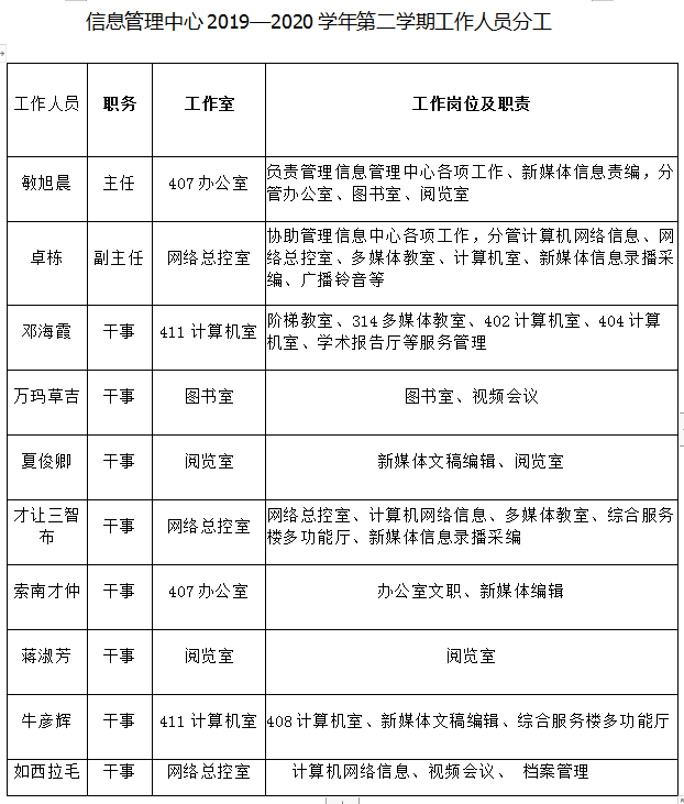 信息管理中心2019—2020学年第二学期工作人员分工