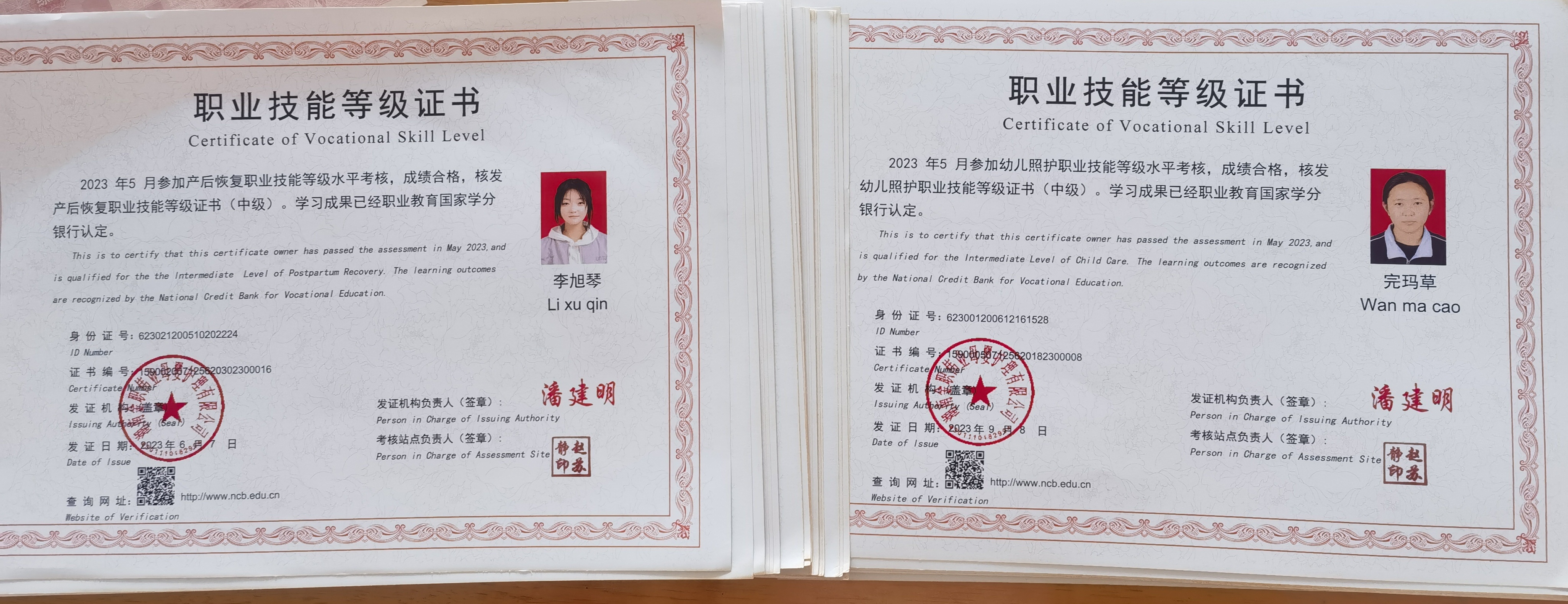 2023年4月7日,公司首次考评“1+X”产后恢复、幼儿照护中级证书。通过专业老师培训、网上答题、现场实操、异地考评员打分等环节,最终共有62名员工通过考试考评,获取了幼儿照护初级证书。通过率达到80%
