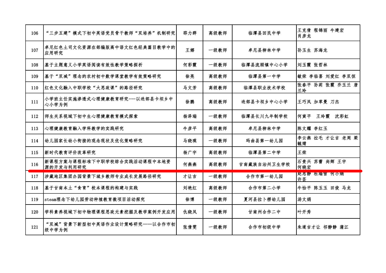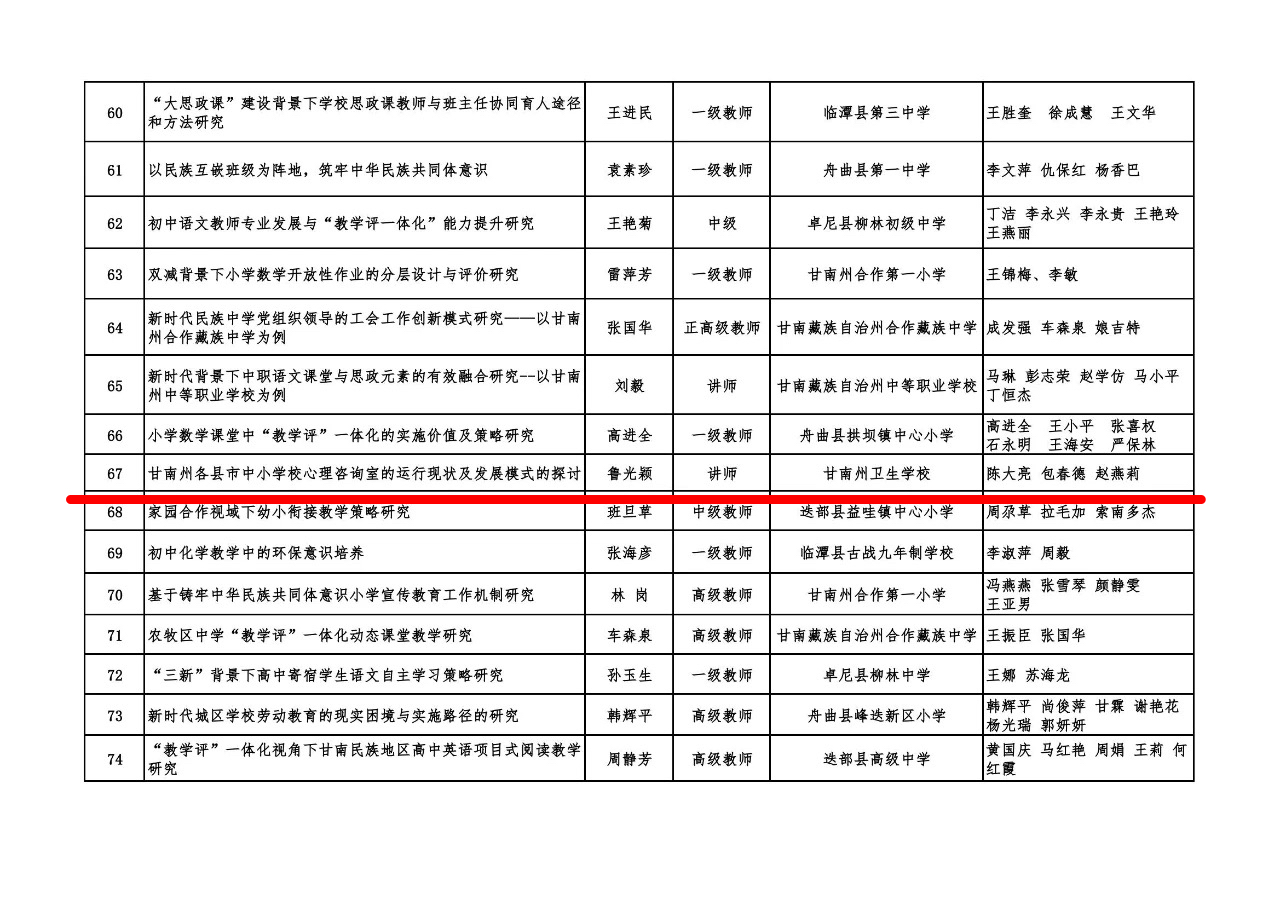 近日,甘南州教育局公布了甘南州2024年教育科学规划课题立项名单,经过层层筛选与严格评审,公司有2项课题脱颖而出,成功获得立项批准。分别是鲁光颖老师申报的《甘南州各县市中小学心理咨询室的运行现状及发展模式的探讨》和何燕燕老师申报的《新课程方案与课程标准下中职公司综合实践活动课程中本地资源的开发与利用研究》。