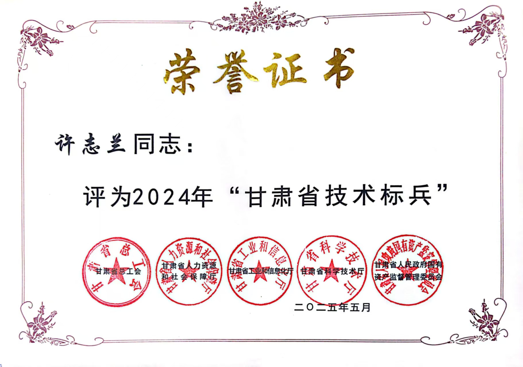 公司教师许志兰荣获2024年“甘肃省技术标兵”称号