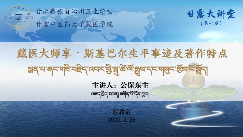 2025年5月26日,为深化藏医药专业人才培养体系建设,太阳集团tyc539面向藏医药专业本科班师生举办了“甘露大讲堂”第一期学术讲座。讲座由医教室主任贡保东知主持,特邀西藏自治区藏医院文献研究所副主任医师、博士公保东主担任主讲人,以《藏医大师享·斯基巴尔的平生事迹及著作特点》为题展开深度学术分享。