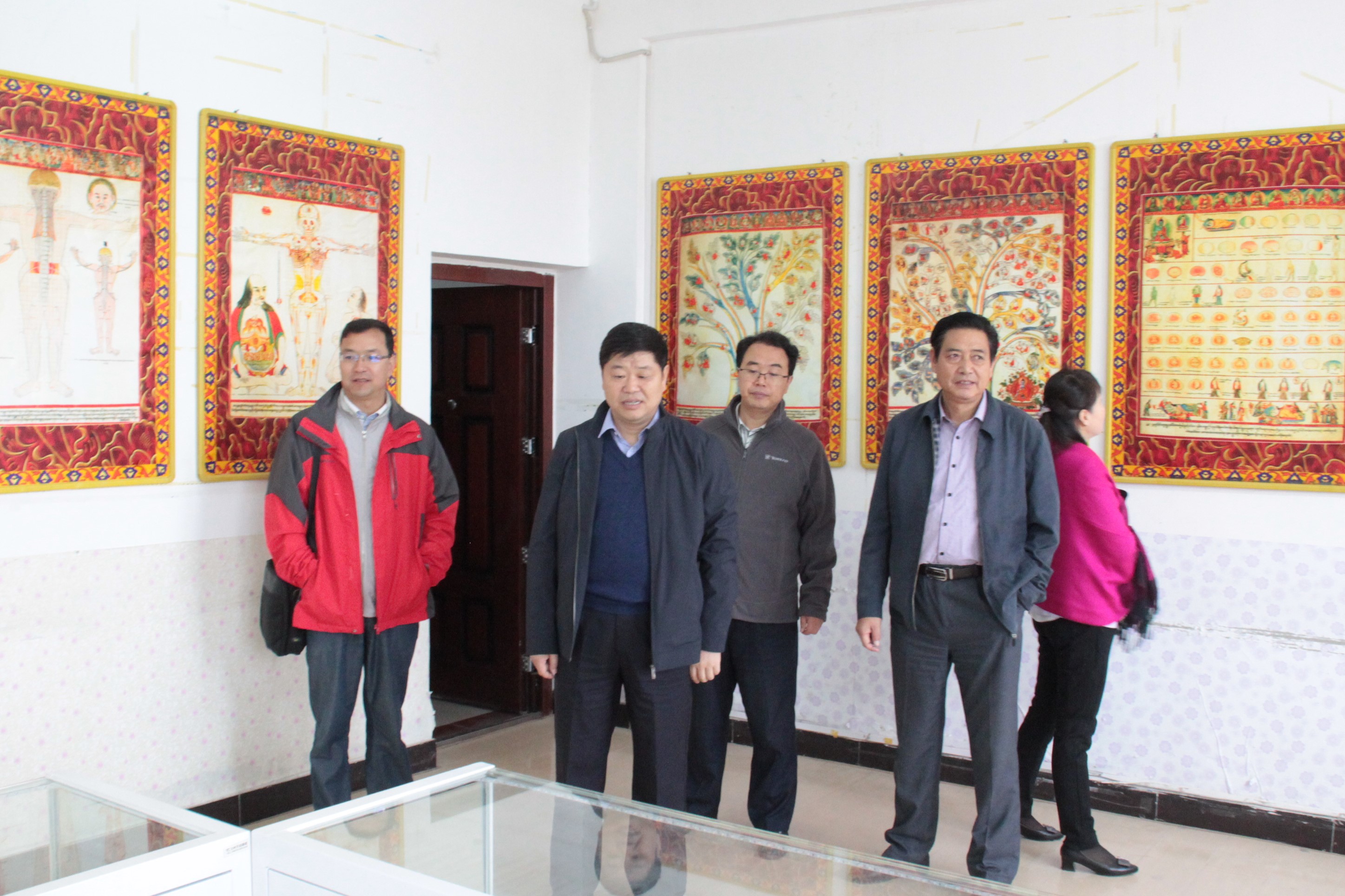 史董事长一行查看了员工2号宿舍楼、大灶餐厅综合服务楼、信息图书综合楼和风雨操场,并详细询问了目前建设情况。查看了藏医唐卡室、藏药标本室等实验室。