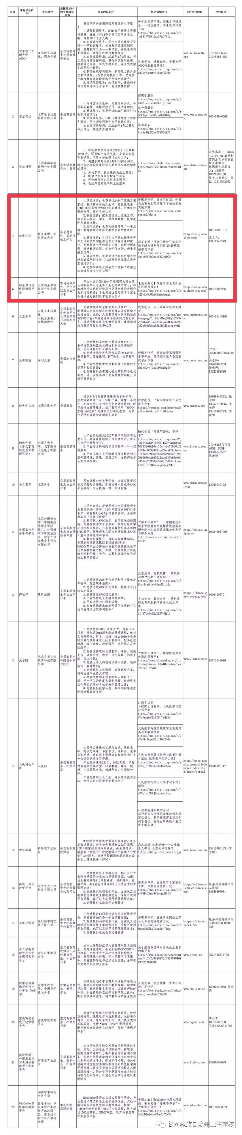 教育部发布的22家在线课程平台,在疫情防控期间支持高校在线教学服务。