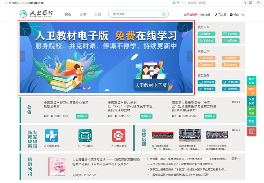 方式二:通过人卫e教首页(medu.pmph.com)登录,点进页面顶部图片进入人卫教材电子版平台首页。