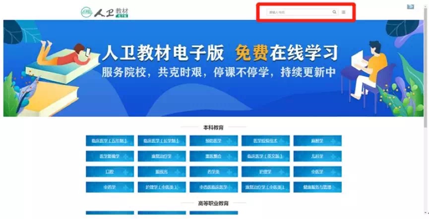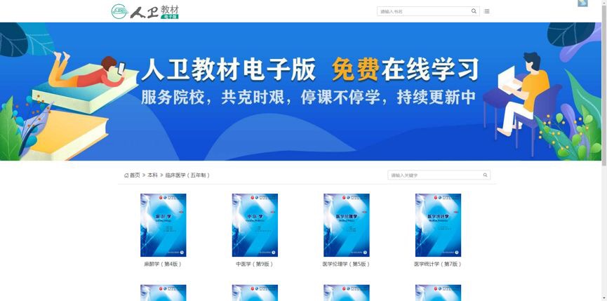1.进入人卫教材电子版在线阅读平台首页后,点击相关专业查看本专业下的所有教材,或在页面右上角搜索框中输入教材名称查找相关教材。