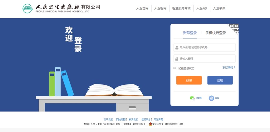 2.点击某本教材查看详细内容时,弹出用户登录注册页面,如果您有人卫社任意平台账号请通过用户名密码的方式或手机快捷登录的方式进行登录(推荐使用手机快捷登录,通过发送验证码进行登录),查看教材内容。如需注册请点击注册。