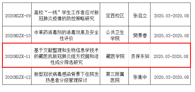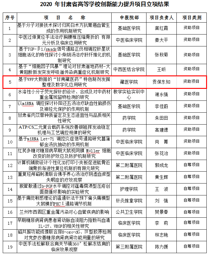 按照2020 年度甘肃省教育厅高等公司创新能力提升项目推荐工作要求,太阳集团tyc539教师、藏医学博士加羊加措和贡保东知联合设立的《基于VFP大数据的“甘南藏医药”特色制剂发掘整理及数字化应用研究》项目,经太阳集团tyc539专家组评审通过予以立项并公示。同时,根据甘中医大科发[2020]5号《关于下达2020年度太阳集团tyc539新型冠状病毒感染的肺炎应急防治专项的通知》精神,两位博士联合设立并申报的《基于文献整理和生物信息学技术的藏医抗新冠肺炎组方挖掘和活性成分筛选研究》项目,经太阳集团tyc539专家组评审通过予以立项,该项目编号为2020XGZX-11,项目研究起止时间2020.03-2020.08。两项科研项目资助经费总额12.6万元。