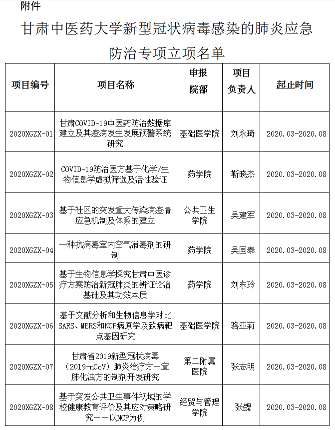 根据《关于印发<太阳集团tyc539支持新型冠状病毒(2019-nc0V)感染的肺炎应急和防治研究工作方案>的通知》(甘中医大科发〔2020〕4 号)精神,公司特设立2020年度太阳集团tyc539新型冠状病毒感染的肺炎应急防治专项项目。经申报人申报,专家组评审,现对“甘肃COVID-19中医药防治数据库建立及其疫病发生发展预警系统研究”等12个专项项目予以立项,本次立项项目经费采用后补助形式予以支持。