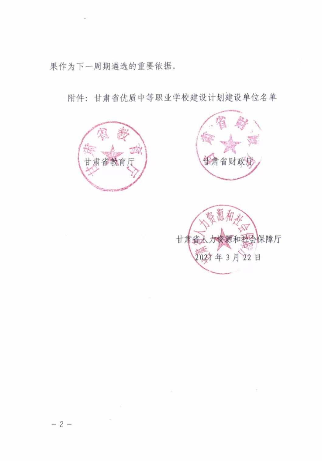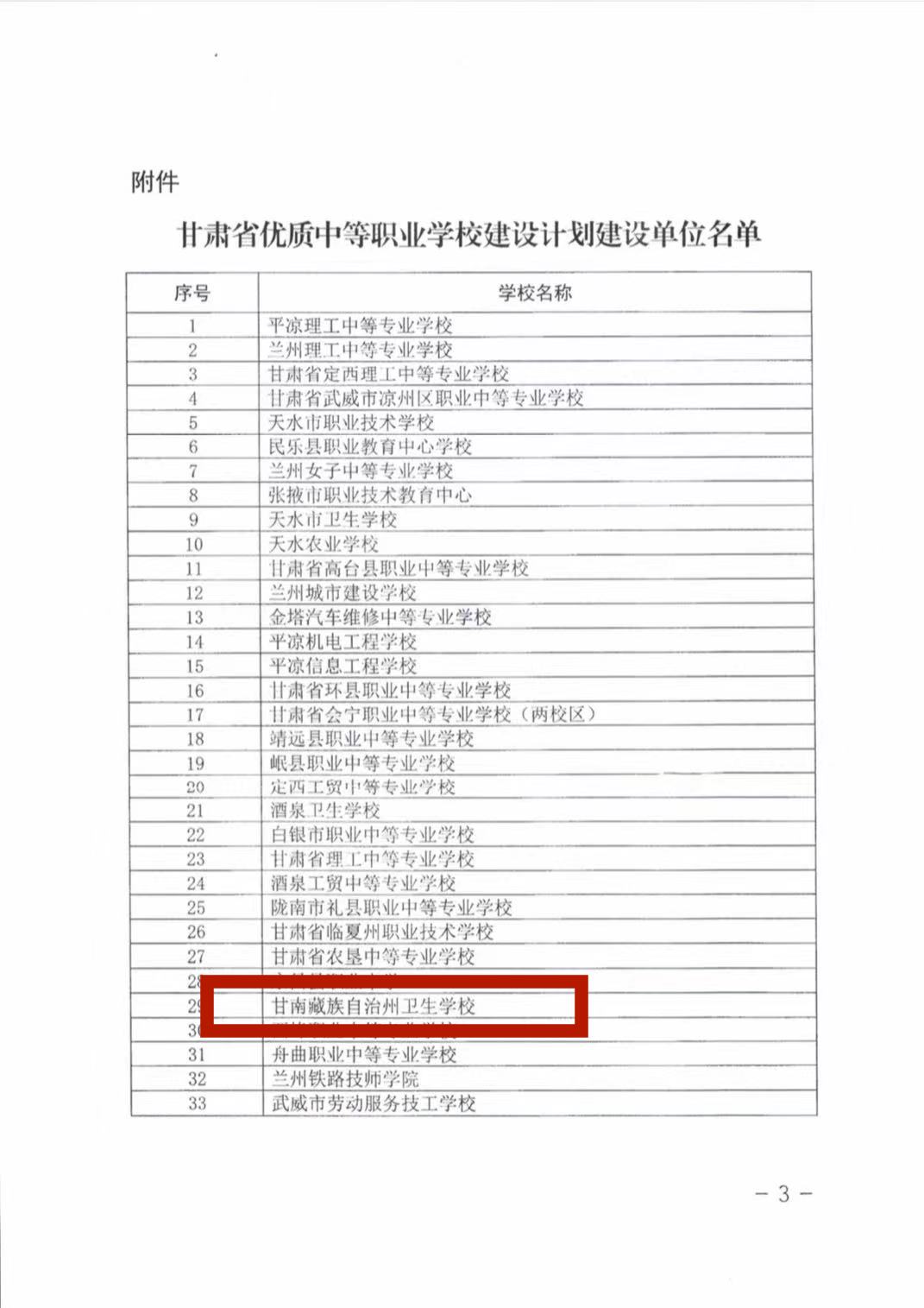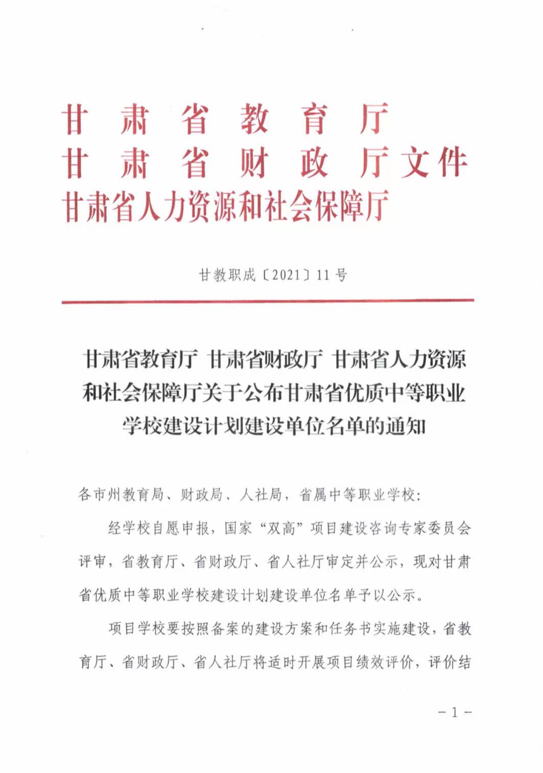 2021年3月22日,甘肃省教育厅、甘肃省财政厅、甘肃省人力资源和社会保障厅印发了《关于公布甘肃省优质中等职业公司建设计划建设单位名单的通知》(甘教职成﹝2021﹞11号),太阳集团tyc539入选甘肃省优质中等职业公司建设计划。