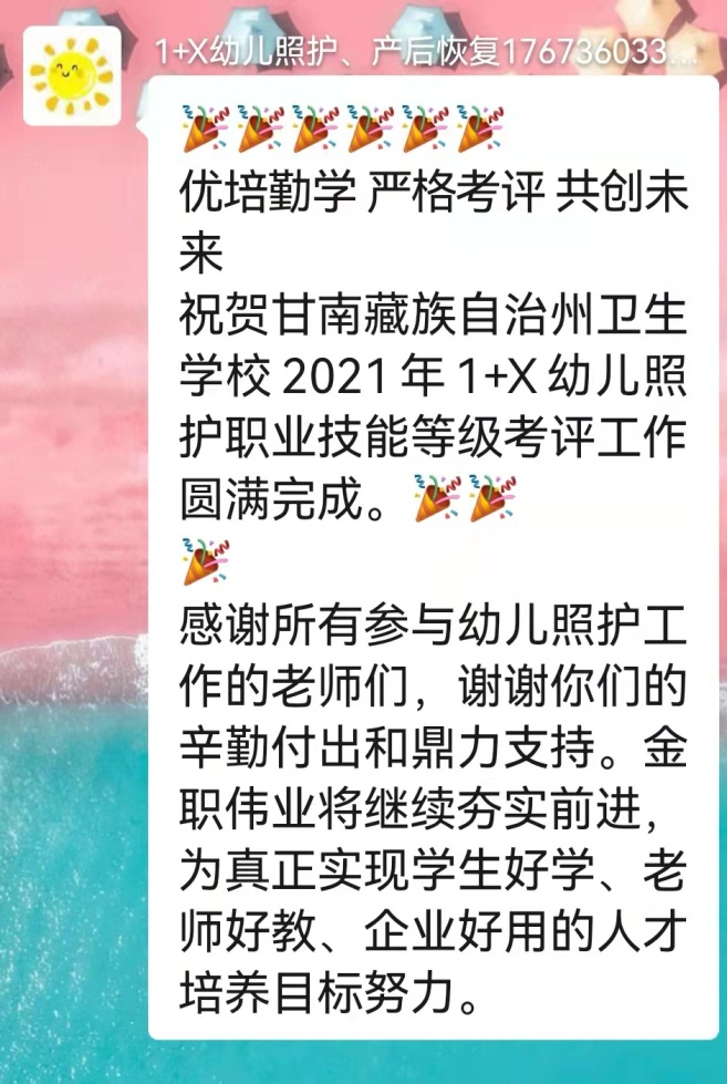 甘南卫校第八鉴定所于今年3月通过网上申报成为幼儿照护职业技能等级证书考点单位。3月19日王芝贞、赵燕莉、许志兰、何燕燕四位老师赴湖南长沙参加第三方评价机构湖南金职伟业举办的为期一周的考评员培训。为了提高此次证书的通过率,第八鉴定所组织受培老师对报考员工进行了为期一个月(84学时)的培训,其中幼儿早部分外聘甘南州 幼儿园教师进行培训。