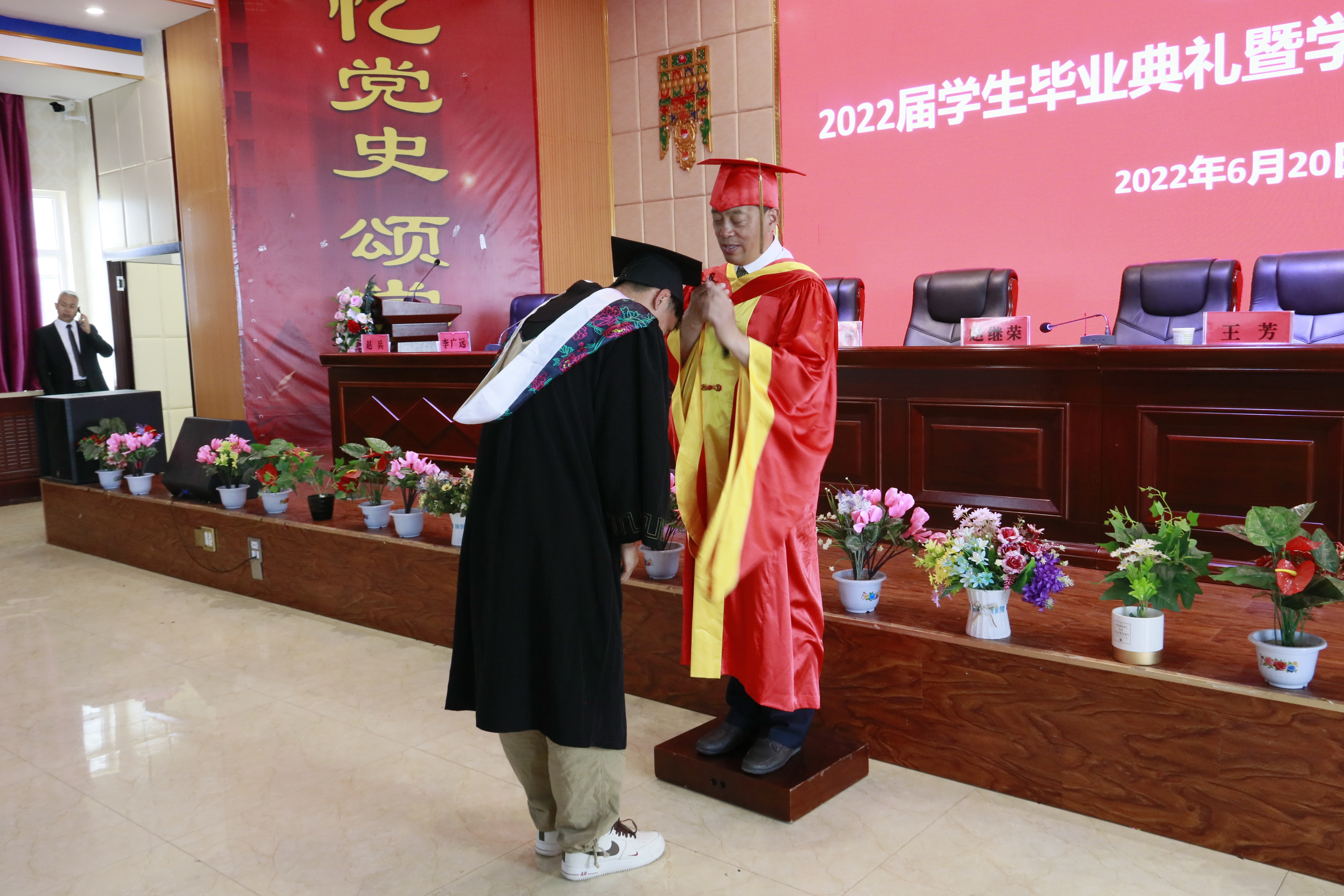 赵继荣董事长为2022届获得学士学位的毕业生授予学位并依次颁发学位证书,拨穗正冠