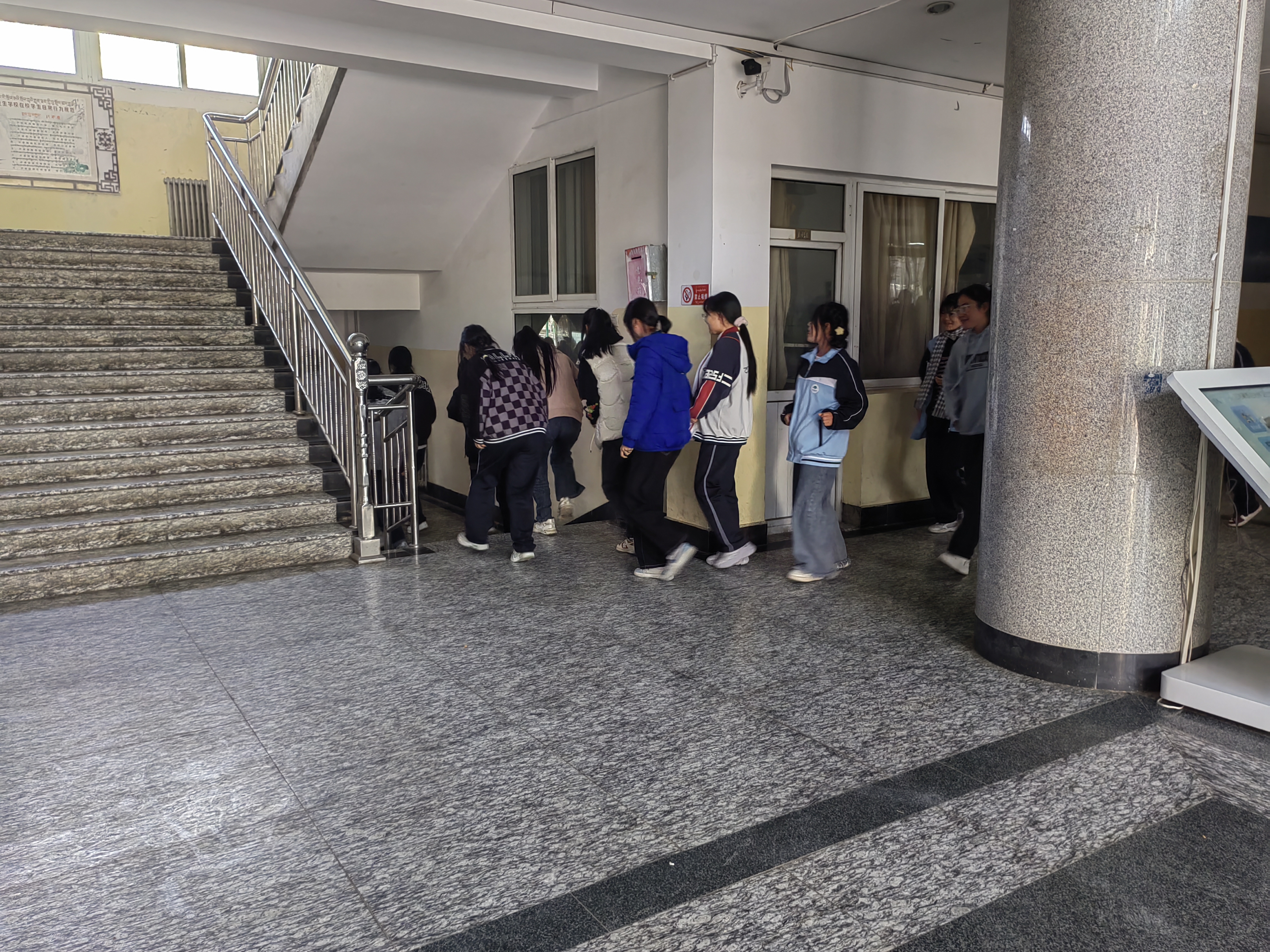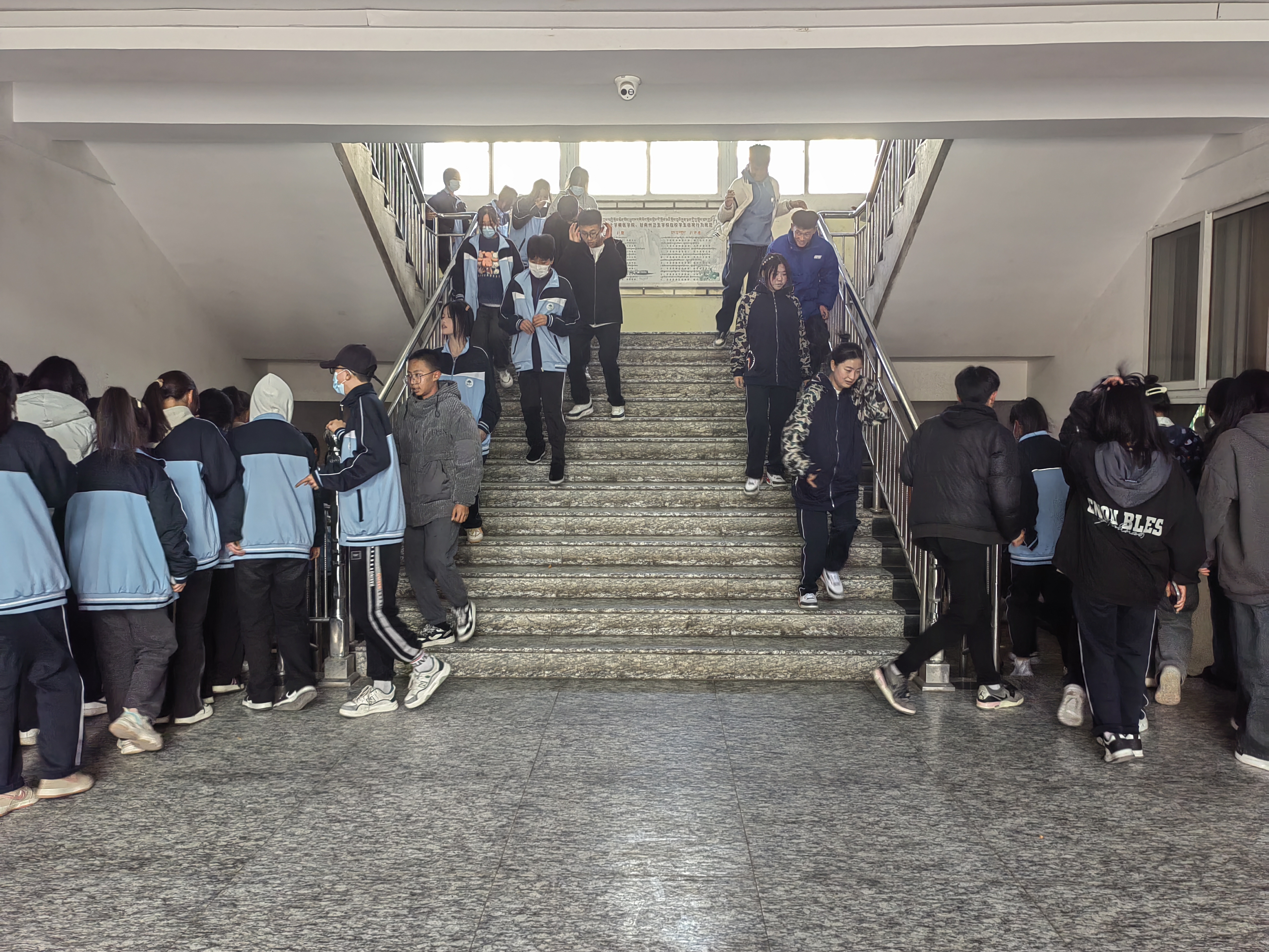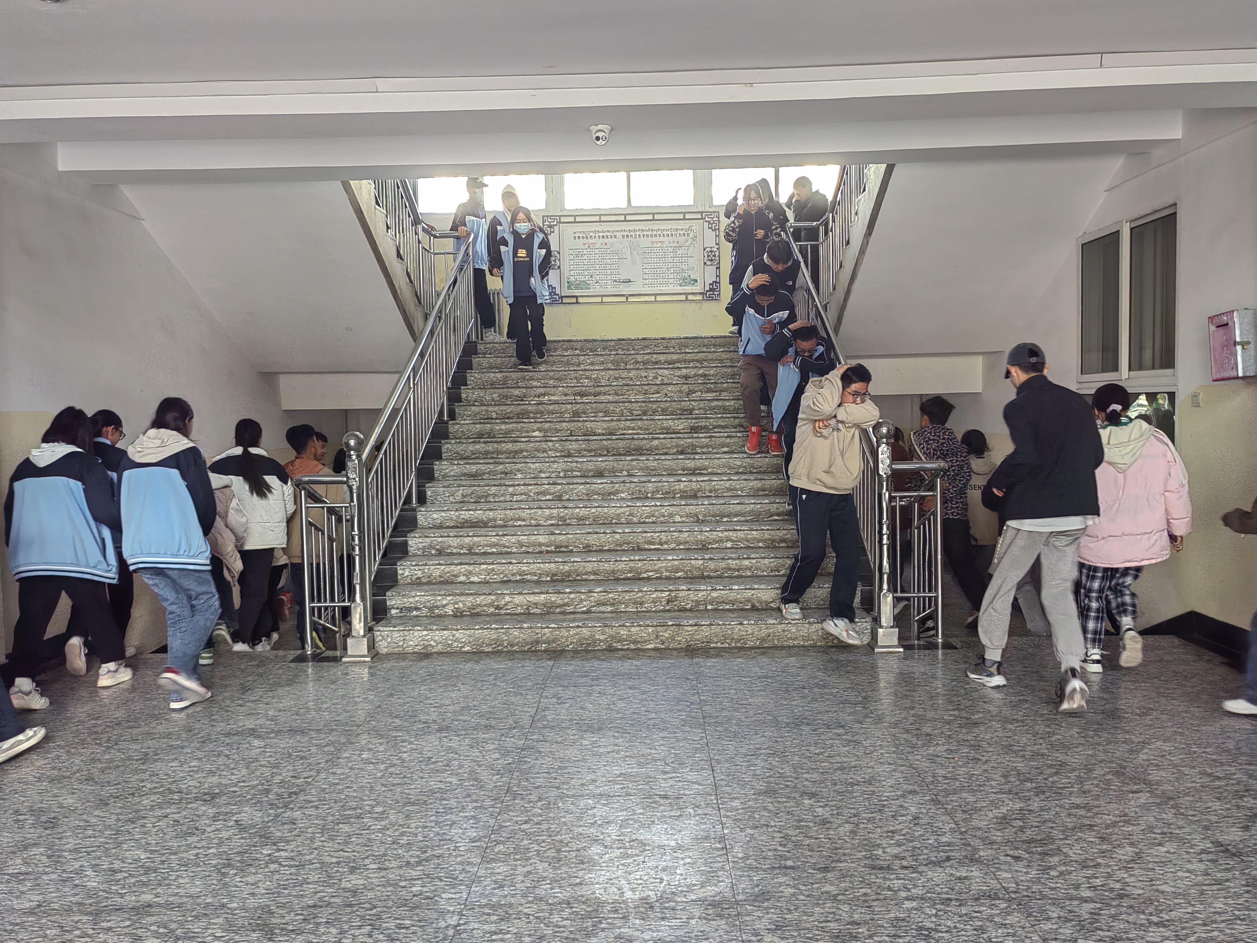 之后随着,警报声响起,应急疏散演练正式拉开序幕,全校师生在班主任的带领下,弯腰低头,以班级为单位,分方向、按路线有序的向安全出口迅速疏散。到达指定安全区域后,各班班主任迅速清单人数,并向现场指挥报告人数,确保不落一人。
